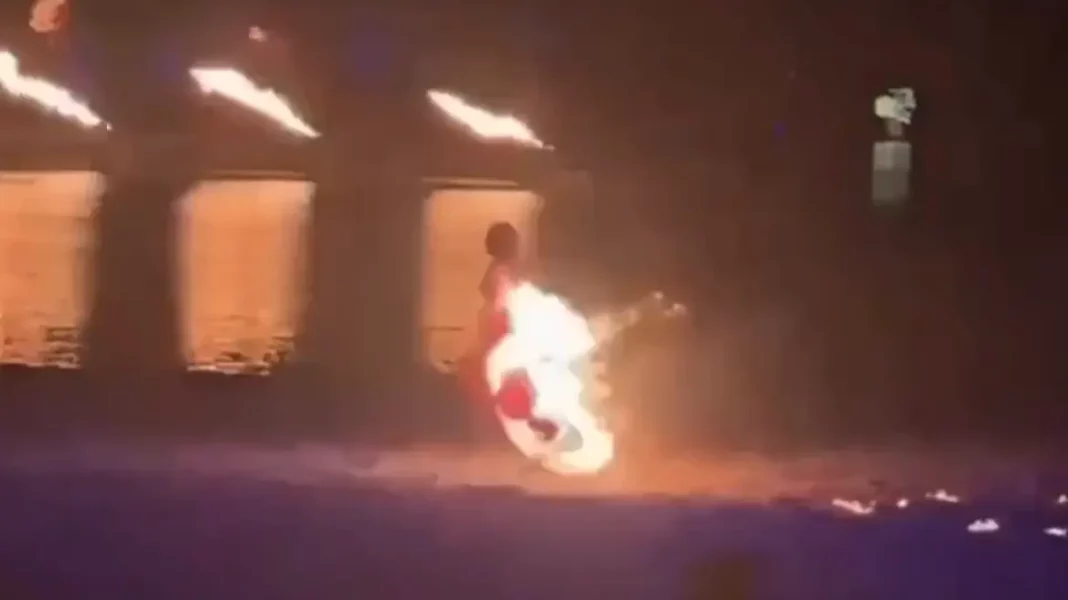 Ωστόσο τα πράγματα δεν εκτυλίχθηκαν όπως αναμενόταν, καθώς η φωτιά «αγκάλιασε» και το φόρεμα με αποτέλεσμα οι φλόγες να αρχίσουν να ανεβαίνουν προς την πλάτη της χορεύτριας.