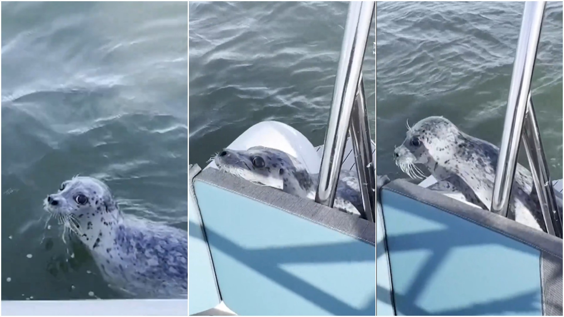 Η φώκια κατάφερε να βγει από το νερό και να σκαρφαλώσει στη μικρή πλατφόρμα στο πίσω μέρος του σκάφους, κοντά στη μηχανή — ουσιαστικά ψάχνοντας για καταφύγιο.