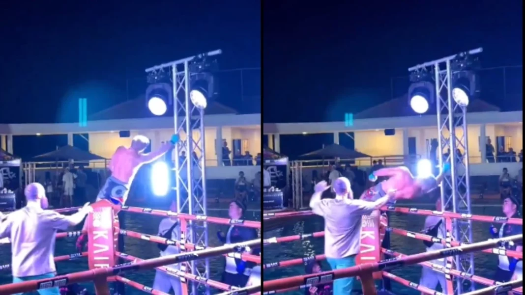 Και εκεί που όλοι πίστευαν ότι έχει χάσει τις αισθήσεις του, εκείνος ξαφνικά… σηκώνεται και πηδά μέσα στην πισίνα που βρισκόταν δίπλα από το ring area.