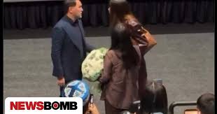Στα πλάνα φαίνεται μία γυναίκα να εντοπίζει τον σύζυγο της, στην πρώτη σειρά των καθισμάτων, έχοντας δίπλα του μία άλλη γυναίκα, που κρατάει στην αγκαλιά της μία τεράστια ανθοδέσμη.