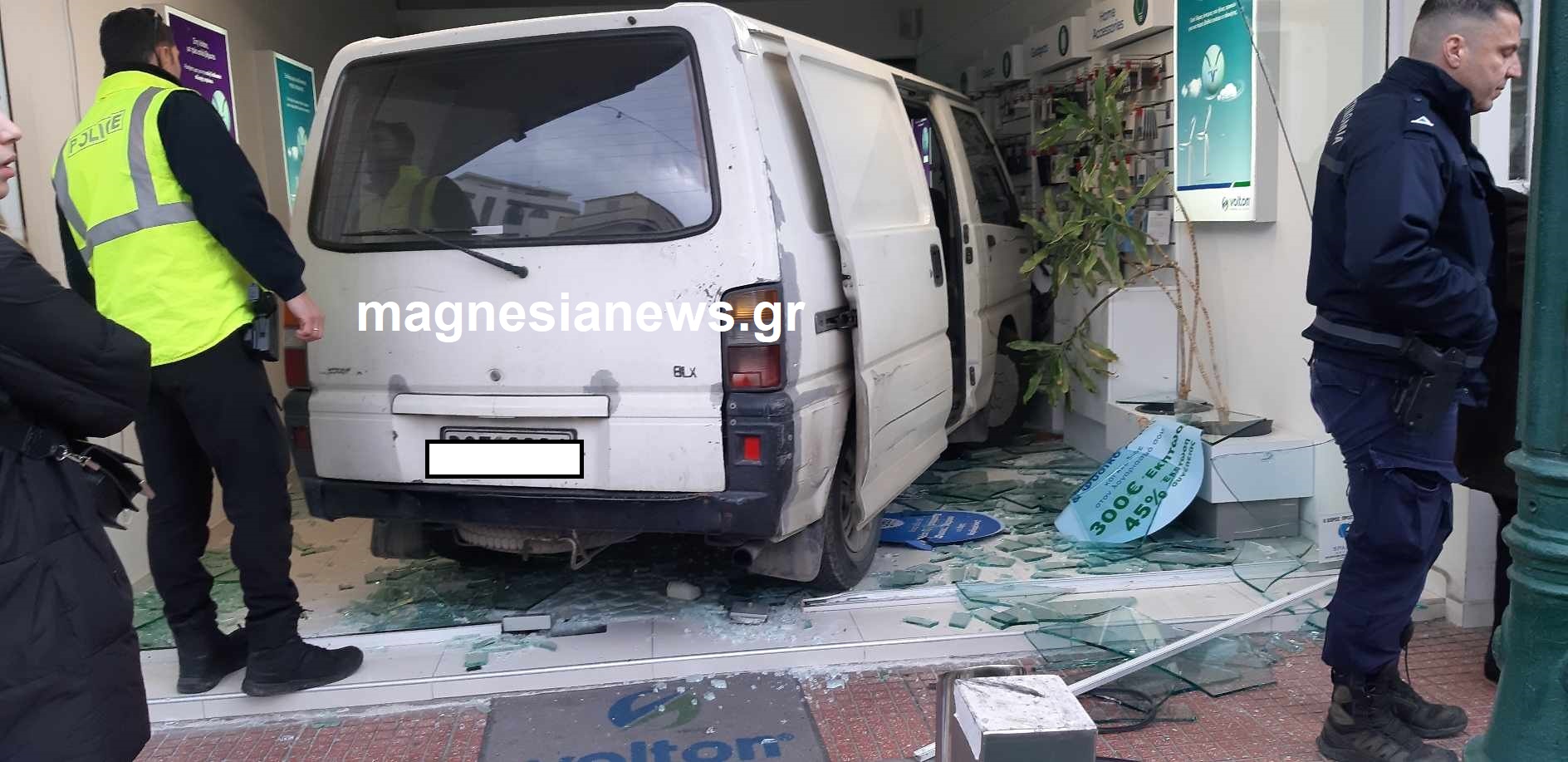 Με το αυτοκίνητο μέσα σε βιτρίνα καταστήματος στον Βόλο κατέληξε μετά τη στροφή της οδού Ιωλκού ένας οδηγός σήμερα, νωρίς το πρωί.