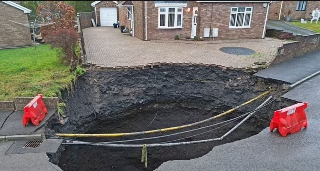 Οι εικόνες δείχνουν μια τεράστια τρύπα που έχει ανοίξει σε έναν κήπο και ρωγμές στο δρόμο. Η περιοχή γύρω από την καταβόθρα έχει αποκλειστεί και ο δρόμος έχει κλείσει.
